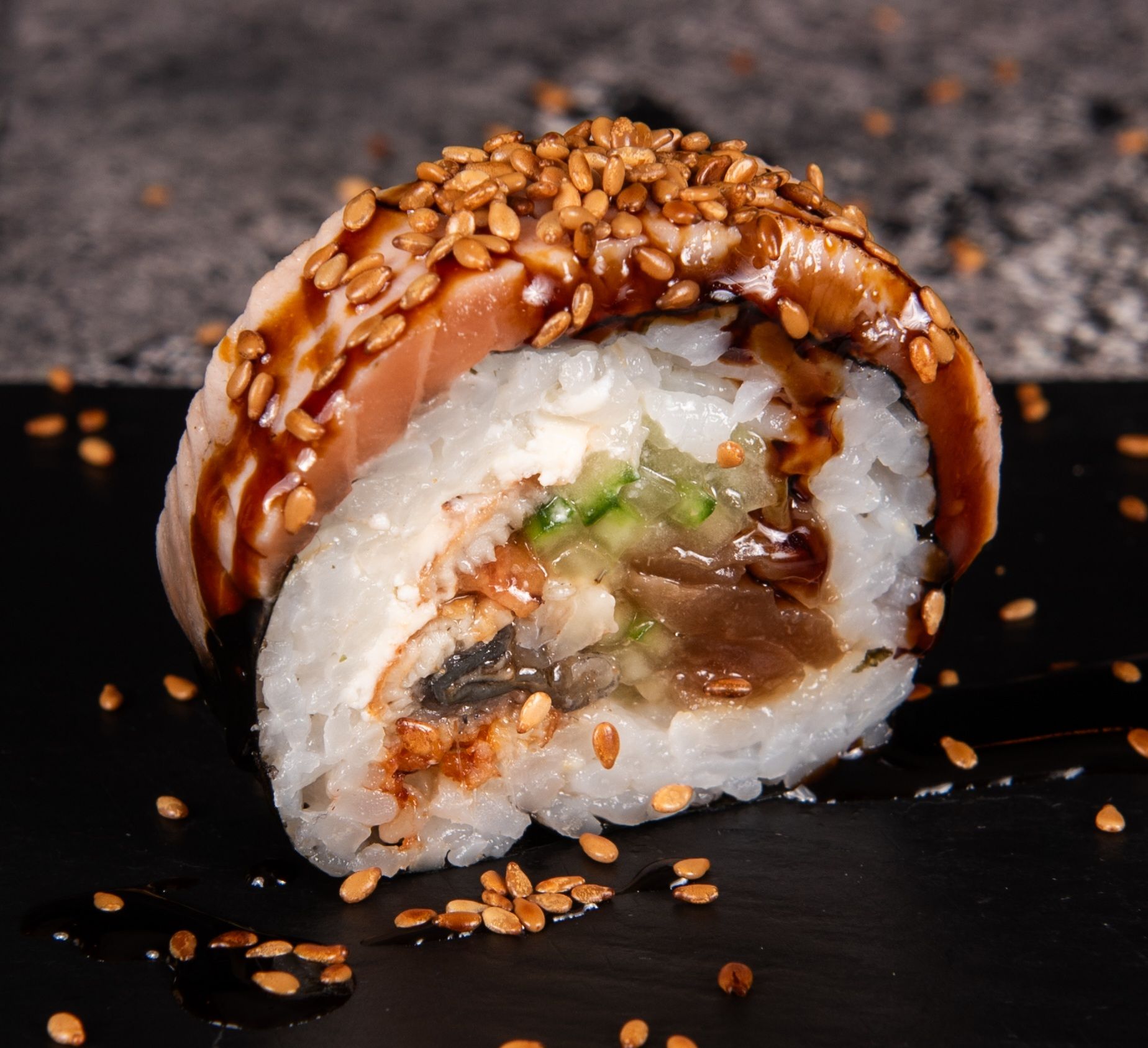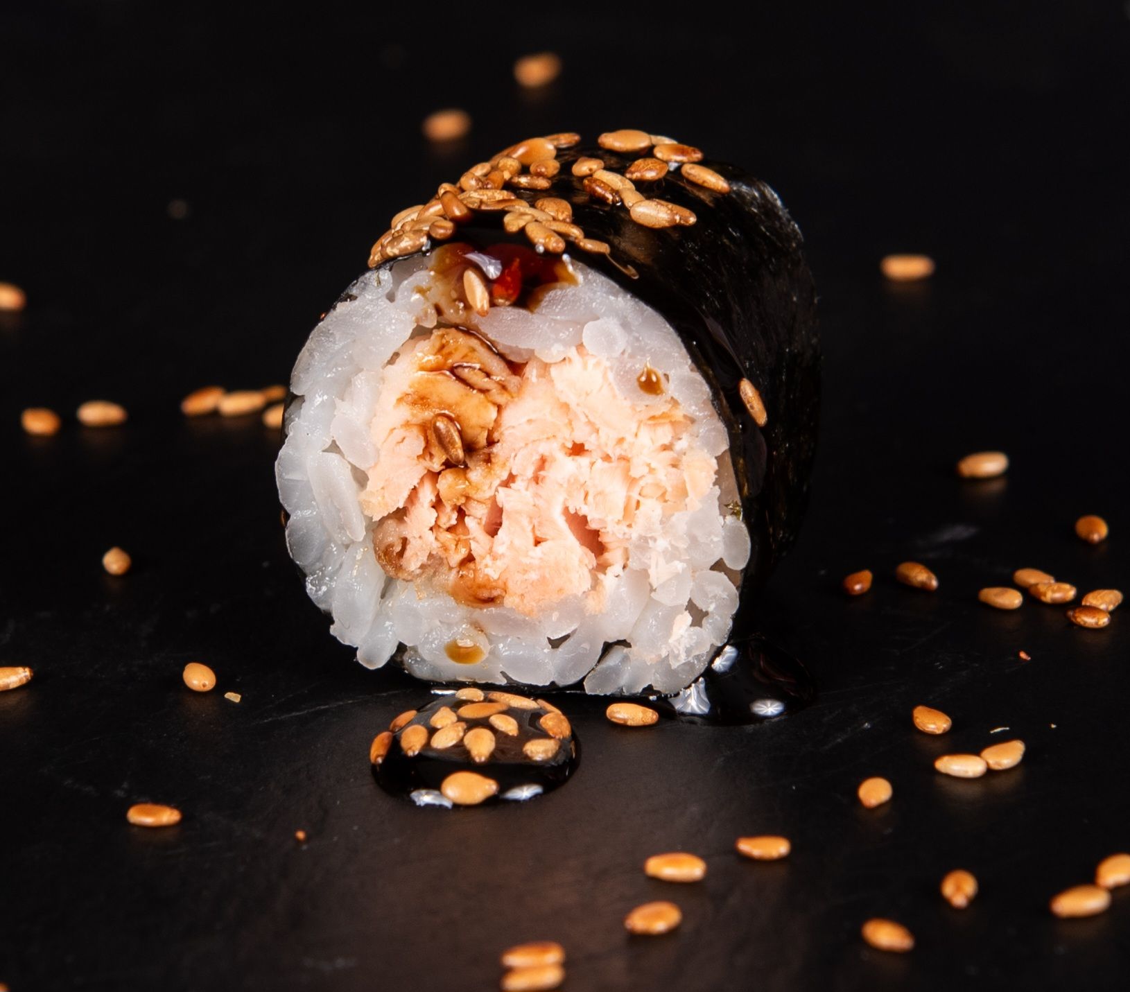 8x uramaki z łososiem grillowanym (awokado, majonez, sos kabayaki, sezam)