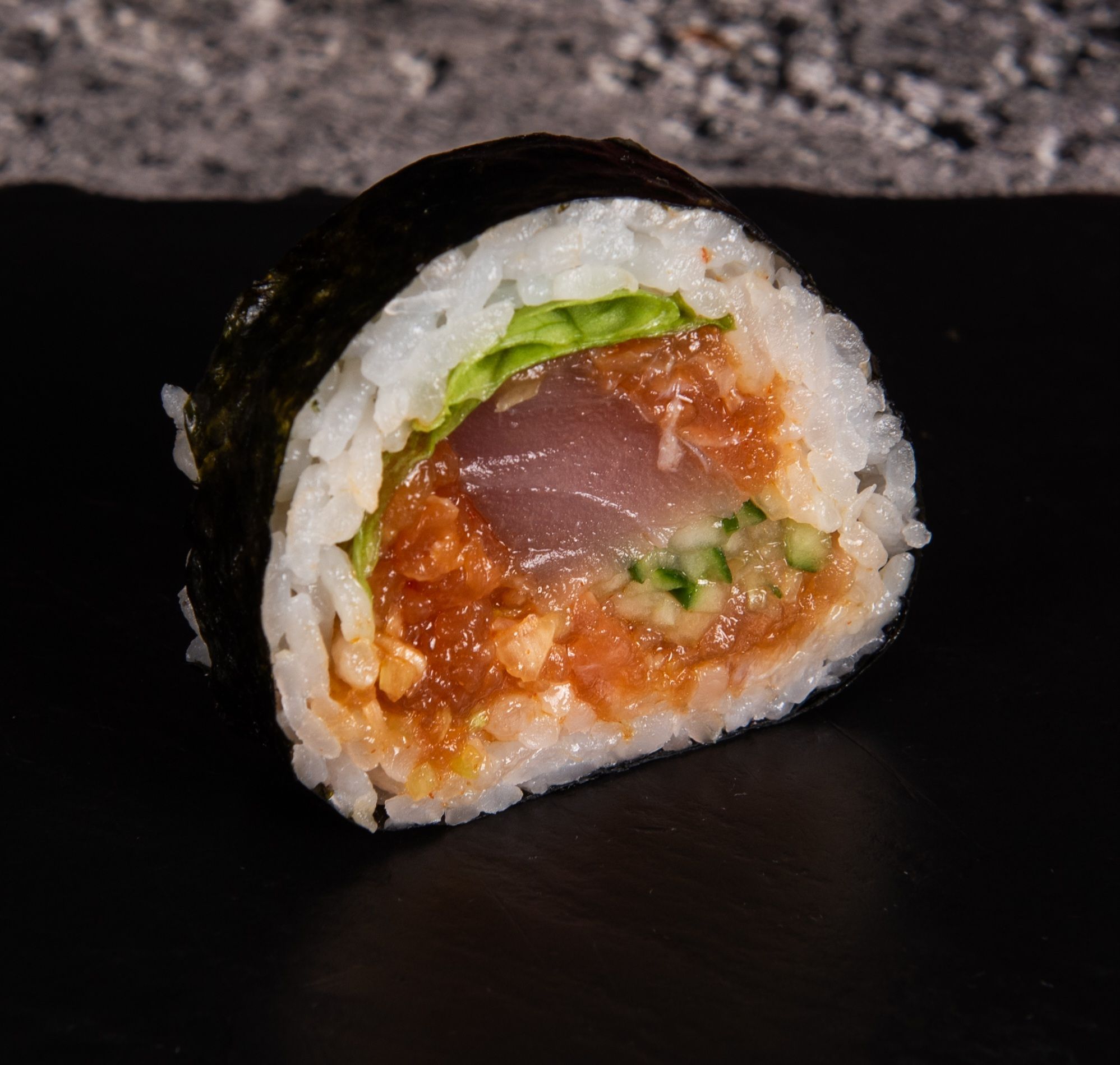 6 x futomaki z tuńczykiem w tempurze (rzodkiew, ogórek, por, sos spicy mayo)