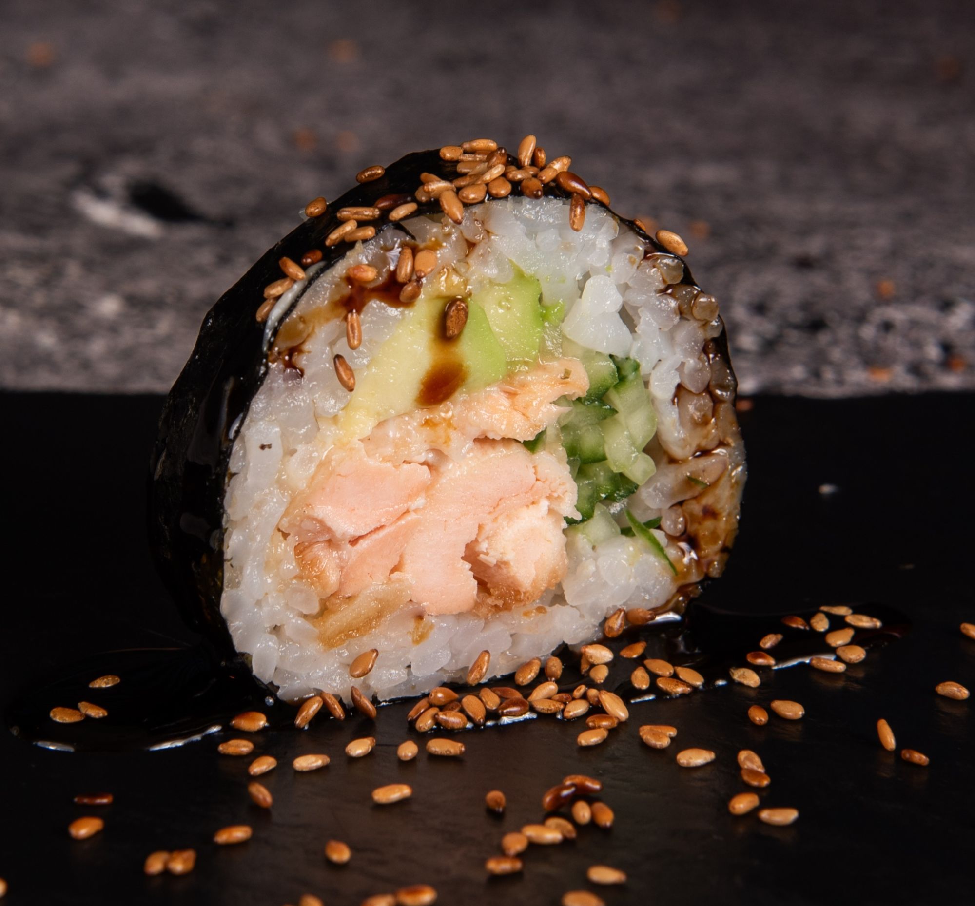 8 x uramaki z łososiem grillowanym (awokado, serek, sezam)